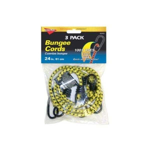 Keeper, 3 Pack, 24, Bungee Cord, Dependable, Vinyl Coated, Heavy Gauge Steel Hook, protective coating won't mar paint prevents rust, All Cord Is Premium Grade, Made From First Quality, Long Lasting Rubber, Durable UV Resistant Outer Jacket Is Woven In Highly Visible, Attractive Colors, Polybag