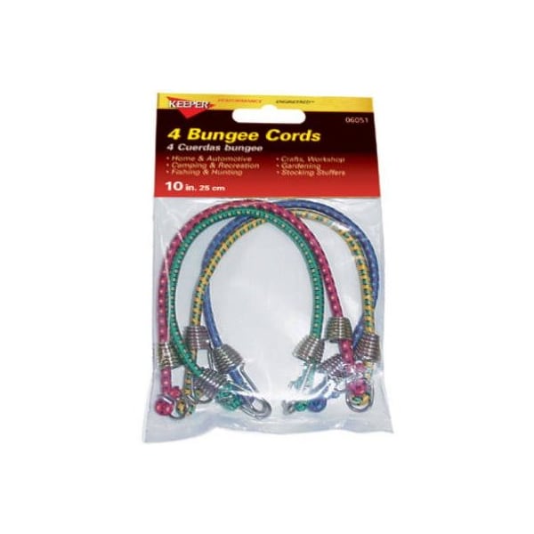 Keeper, 4 Pack, 10, Mini Bungee Cord, 1001 Uses For Around The House, Workshop, Camping, Steel Hooks, Cord Is Premium Grade, Made From First Quality, Long Lasting Rubber, Durable UV Resistant Outer Jacket Is Woven In Highly Visible, Attractive Colors, Polybag