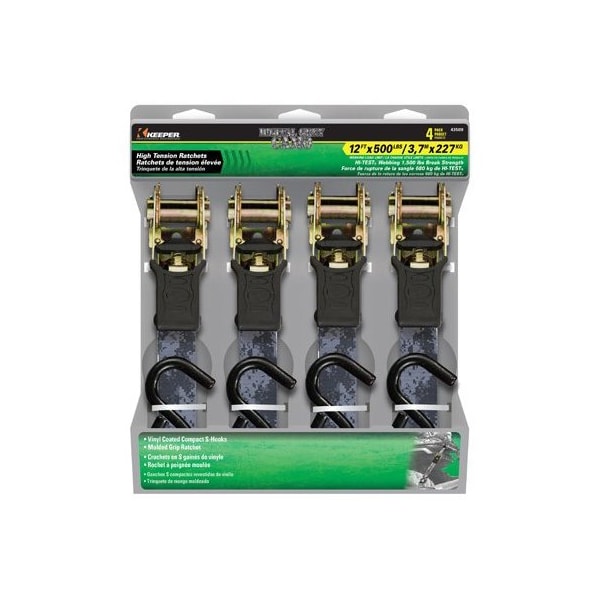 Keeper, 4 Pack, 1 x 12', Digital Gray Camo, Ratchet Tie Down, 500 LB Working Load Limit, 1500 LB Break Strength, Engineered To Provide A Safe, Efficient Methods Of Securing Cargo For Transport, Use For Securing Smaller Loads, For Demanding Or Unpredictable Conditions, Maximize Tension, A Spring Loaded Release Ensures That The Ratchet Will Never Open Accidentally, So Safety Always Comes First, Compact, Vinyl Coated S Hooks Are Protected From Rust Wear, Webbing Resists Rot Abrasion So The Tie Down Retains Its Durability