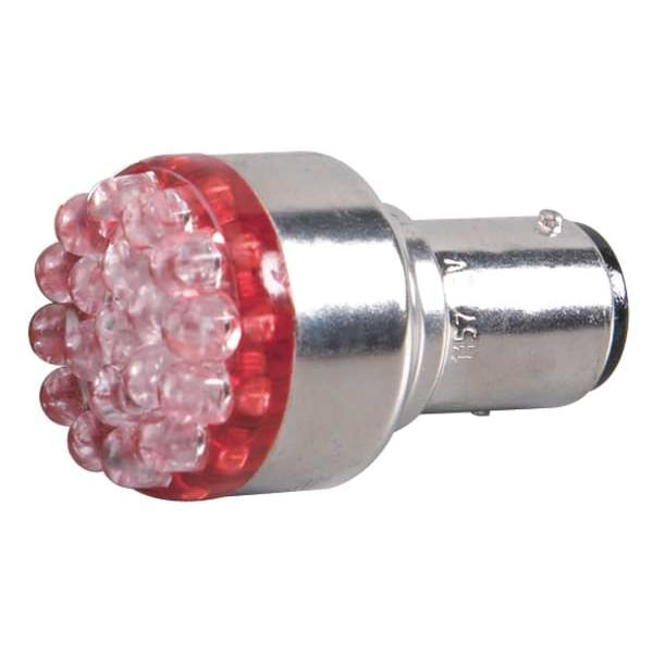 Miniature LED Bulb, Trade Number 1157, Bulb Shape S8, Bulb Base Type Double Contact Bayonet (BA15d), 12-24 Voltage, Automotive, 1.5 Watts, Bulb Type Miniature, Light Appearance No Rated Color Temp, Red, Average Bulb Life 8000 hr., Light Color Red, Bulb Housing Polycarbonate, Bulb Power Source Direct Wired