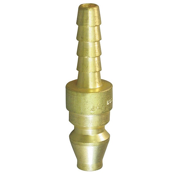 Quick Coupler Plug, Locking Type Sleeve, Material Brass, Finish Brass, Hose Connection Hose Barb, Body Size 1/4 in, Barb Size 5/16 in, Max. Flow 21 cfm, Max. Pressure 1,500 psi, Color Code Red, Temp. Range -40 Degrees to 250 Degrees F, Seals Nitrile, Application Standard and Oxyacetylene Service, Standards OSHA Compliant