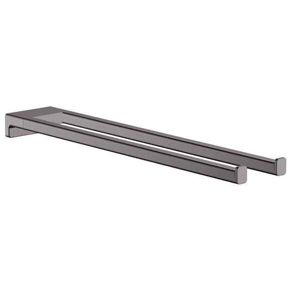 hansgrohe Wall Mounted Double Arm Towel Rail in Brushed Black Chrome With the AddStoris towel rail from hansgrohe the bathroom is both functional and visually enhanced. On the approx. 17.5 in long and 3.2 in wide holders, two towels are always at hand and quickly dried. The modern and reduced design impresses with a clear, expressive design. It fits particularly well with geometric bathroom fittings, such as the hansgrohe line Metropol. Nice that the hansgrohe quality keeps what the high-quality design promises: the AddStoris towel rail is made of metal and therefore particularly durable. This helps in the sustainable use of resources and reduces the plastic content in the environment. The brushed surface in brushed black chrome is easy to clean. It corresponds to the color of the hansgrohe special surfaces for fittings (FinishPlus). So everything fits perfectly together. Easy to install. The towel rail is reliably attached to the wall with two screws. The drilling distance is 0.9 in. Thanks to the rigid design of the two rods, the attachment remains stable for a long time.
