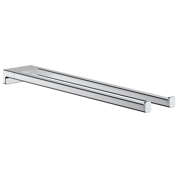 hansgrohe Wall Mounted Double Arm Towel Rail in Chrome With the AddStoris towel rail from hansgrohe the bathroom is both functional and visually enhanced. On the approx. 17.5 in long and 3.2 in wide holders, two towels are always at hand and quickly dried. The modern and reduced design impresses with a clear, expressive design. It fits particularly well with geometric bathroom fittings, such as the hansgrohe line Metropol. Nice that the hansgrohe quality keeps what the high-quality design promises: the AddStoris towel rail is made of metal and therefore particularly durable. This helps in the sustainable use of resources and reduces the plastic content in the environment. The surface is elaborately chrome-plated and is easy to clean. This means that the brilliant shine is maintained permanently. Easy to install. The towel rail is reliably attached to the wall with two screws. The drilling distance is 0.9 in. Thanks to the rigid design of the two rods, the attachment remains stable for a long time.
