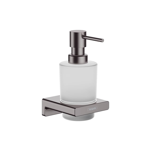 Attractive soap dispenser from hansgrohe in brushed black chrome With the AddStoris soap dispenser from hansgrohe the bathroom is both functional and visually enhanced. The glass container takes approx. 16 oz of liquid soap and dispenses it cleanly portioned by pressing the pump. The modern and reduced design impresses with a clear, expressive design. It fits particularly well with geometric bathroom fittings, such as the hansgrohe line Metropol. Nice that the hansgrohe quality keeps what the high-quality design promises: the AddStoris soap dispenser is made of metal and glass. It is therefore particularly durable. This helps in the sustainable use of resources and reduces the plastic content in the environment. The brushed metal surface in brushed black chrome is easy to clean. It corresponds to the color of the hansgrohe special surfaces for fittings (FinishPlus). So everything fits perfectly together. Easy to install. The soap dispenser is reliably attached to the wall by two screws. The drilling distance is 0.9 in.
