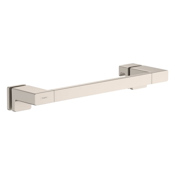 High quality shower door handle from hansgrohe in brushed nickel With the AddStoris shower door handle from hansgrohe the bathroom is both functional and visually enhanced. It not only opens and closes the shower door reliably, but also serves as a practical towel rail. The modern and reduced design impresses with a clear, expressive design. It fits particularly well with geometric bathroom fittings, such as the hansgrohe line Metropol. Nice that the hansgrohe quality keeps what the high-quality design promises: the AddStoris shower door handle is made of metal and therefore particularly durable. This helps in the sustainable use of resources and reduces the plastic content in the environment. The brushed surface in brushed nickel is easy to clean. It corresponds to the color of the hansgrohe special surfaces for fittings (FinishPlus). So everything fits perfectly together. Easy to install. The shower door handle is placed on the door from the inside and outside and fastened with two screws. The hole spacing is approx. 13.8 in; the Diameter of the drill hole is approx 0.5 in. The glass thickness can be between 0.25-0.5 in.