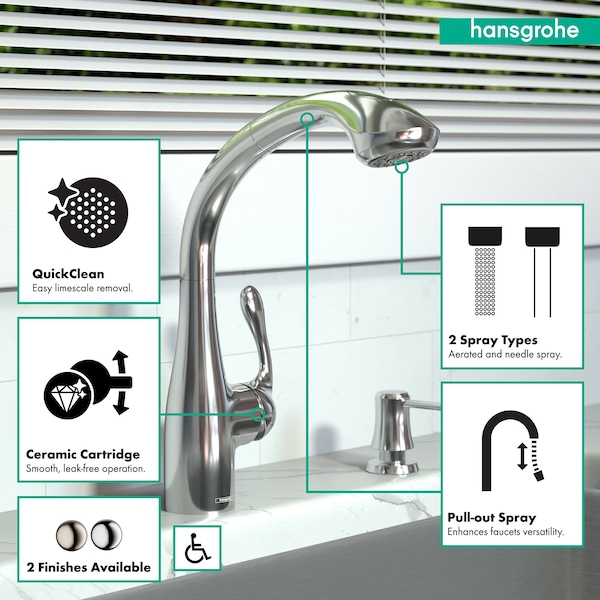 Design With a range of models and styles, paired with the quality and design you expect from hansgrohe, dream kitchens become a reality. Kitchen faucets by hansgrohe exude beautiful design, superior durability, and unique features that are intuitive to use. Pick your desired faucet, then browse the entire product suite for complementary fixtures. German engineering ensures a lifetime of consistent and dependable operation. Maintenance Products that function perfectly are essential. To ensure that they do, every hansgrohe kitchen faucet is 100% air-tested in production. The silicone aerator and spray nozzles help optimize water flow performance, resist mineral deposit build-up, and are designed to be easily wiped clean. Installation Can be installed over existing multi-hole counter configurations. Standard 3/8-inch pipe connection hoses included. Baseplate sold separately. Please comply with all local, state, and federal plumbing codes and regulations. Installation instruction link below.