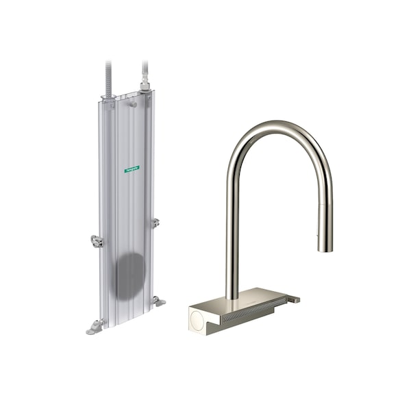 The striking high arc spout stands out and emphasises the synergy between angles and curves. The adjustment on the pull-out spout guarantees the spray type that's right for your project. Simply switch between the laminar and shower spray using the lockable button. With the Select function on the faucet's base, a simple touch of a button is all it takes to switch to the flat, gentle vegetable shower. The faucet also features a single-lever handle on the side for turning the water on and off and controlling the temperature. The included sBox makes it easy to pull out the hose, which is safely retracted and stored under the sink after use. The high arc spout boasts a radius that can be set to prevent it swivelling beyond the sink.