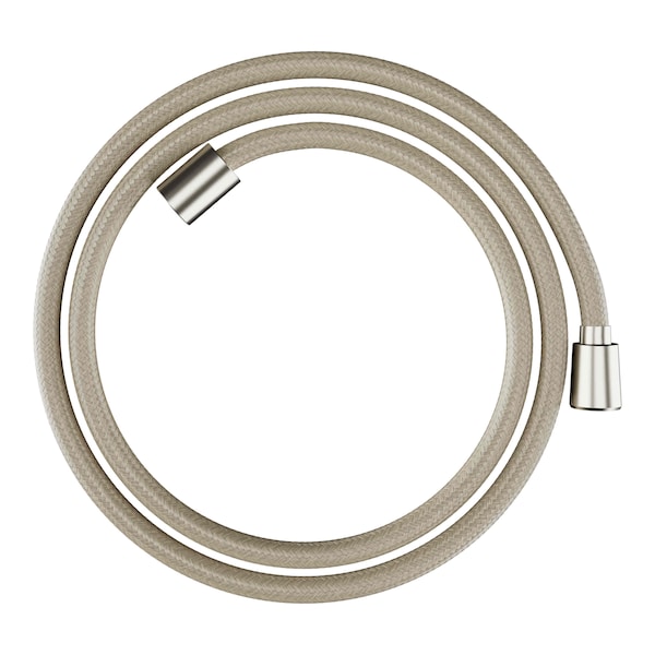 Effortless showering: Designflex textile shower hose from hansgrohe in brushed nickel (63-inch). Experience a completely new showering sensation with the Designflex textile shower hose. Because the world exclusive from hansgrohe is significantly lighter than a comparable hansgrohe shower hose. Designflex consists of multi-colored, braided yarns that offer even more freedom of movement and flexibility. When showering, the cotton-like material pampers you with a pleasantly warm and soft feeling on the skin.The multi-colored textile mesh fascinates with an individual design that perfectly matches the colors of the FinishPlus finishes of hansgrohe showers and mixers. Together, they create a cozy ambience and transform your shower into an oasis of well-being. hansgrohe Designflex - the magic is in the detail. A sense of well-being: The yarns used are made from recycled PET and thus help protect the environment. Known and proven in outdoor and water sports: the high-density braid is waterproof, dirt-repellent and extremely long-lasting. Extra clean: the shower hose is easy to clean and is even dishwasher safe up to 140 °F. Universally suitable: hansgrohe Designflex fits every shower head and every normal water connection (1/2 inch)
