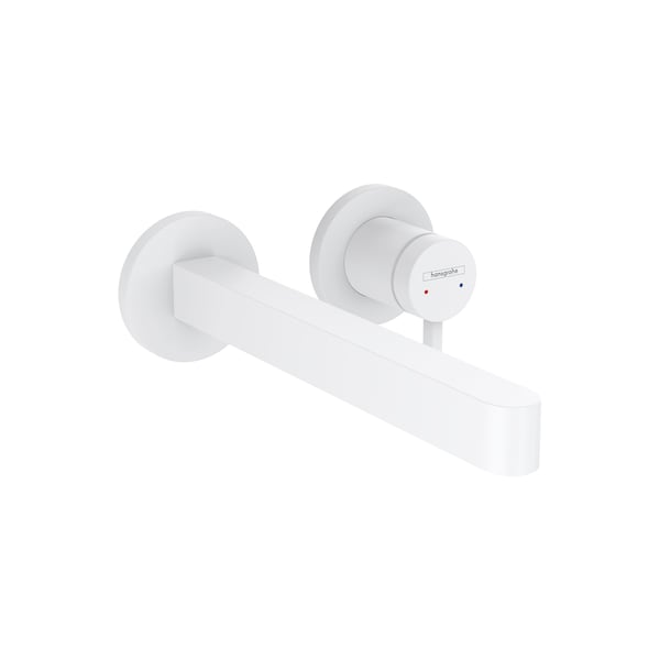 Slim design single lever mixer faucet for wall mounting The Finoris 2-hole wall-mounted bathroom faucet from hansgrohe stands out: thanks to its sleek, geometric shape and clever Installation in the wall. This creates more space around the sink and can also be combined well with a free-standing vessel sink. The minimalist design sets an expressive accent in the bathroom with the brilliant, Easy-to-clean surface in matte white. The high quality faucet keeps what the elegant shape promises. The pin handle controls a smooth-running ceramic mixing system from hansgrohe. It reliably regulates water quantity and temperature with one hand. The quiet and crystal clear laminar spray continues the slim fitting body and forms a harmonious unit. Thanks to hansgrohe EcoRight technology, the fuacet designr is particularly water-saving. It uses a maximum of 1.2 GPM - even at high water pressure. Drain fitting included. The included non-locking drain fitting is used for sinks and washbasins without overflow. It prevents water from overflowing. More flexibility in bathroom design: the handle can be placed either on the right or left. Depending on how the base body is mounted in the wall.