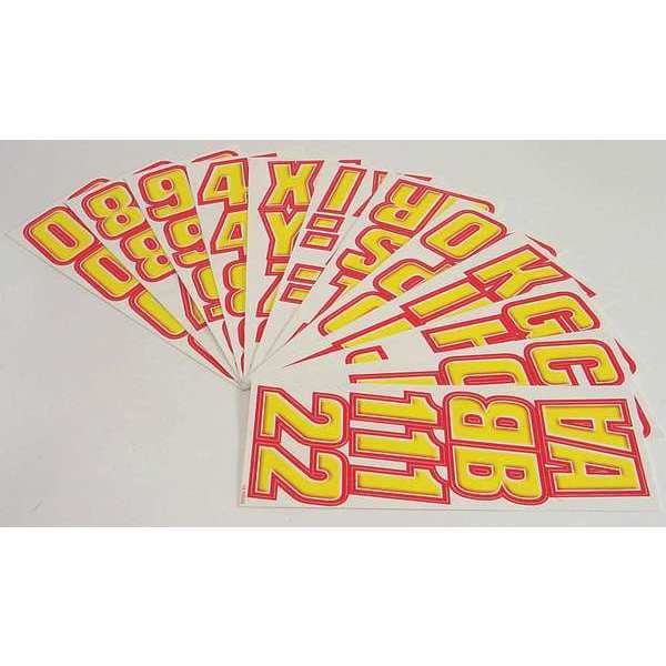 Letter and Number Label Set, Adhesive Type Permanent Adhesive, Application General Identification, APWA Compliant Color Not Applicable, Background Color Not Applicable, Character Color Red/Yellow, Character Height 2 in, Character Outline Color Red, Character Type Letters/Numbers, Characters Included 0 to 9; A to Z, Die Cut Yes, Embossed No, Font Proprietary, Includes (2) Set of A to Z Characters, (4) Set of 0 to 9 Characters, Indoor/Outdoor Usage Indoor/Outdoor, Letter Casing Not Applicable