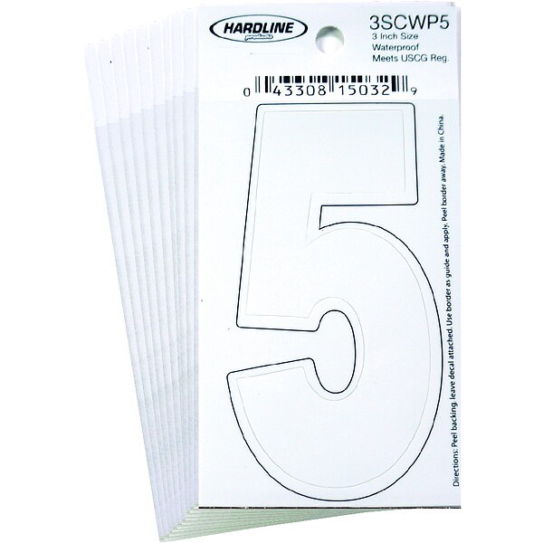 Number Label, Adhesive Type Permanent Adhesive, Application General Identification, USCG, APWA Compliant Color Not Applicable, Background Color Not Applicable, Character Color White, Character Color Gradient Solid Color, Character Height 3 in, Character Outline Color Not Applicable, Character Type Numbers, Characters Included 5, Die Cut Yes, Embossed No, Font Dyer, Includes (10) Pack, Indoor/Outdoor Usage Indoor/Outdoor, Letter Casing Not Applicable, Material Vinyl