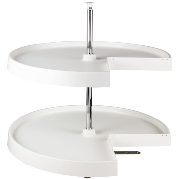 Optimize corner cabinets with this 28" diameter pie-cut lazy Susan set. Door attaches directly to lazy Susan shelf, great for tight spaces. Sturdy polymer plastic trays with robust rib construction make for a secure shelf. Telescoping pole locks in place at your desired height. Shelves rotate dependently, and hubs have a positive stop, so door stops at opening. Patented height adjustment wheel that is easily accessible for fine tuning of door height. Each unit is tested to exceed BHMA Class-1 specifications of 20 pounds per square foot for 75,000 cycles. Set includes two shelves, pole, all mounting hardware, cardboard template, and installation instructions. Fits interior heights of 25-7/8" to 32".