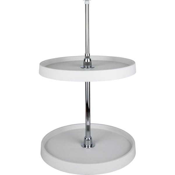 Optimize corner cabinets with a 28" round lazy Susan set. Sturdy polymer plastic trays with robust rib construction make for a secure shelf. Chrome metal hubs add a stylish accent. Telescoping pole locks in place at your desired height. Each shelf is independently rotating. Each unit is tested to exceed BHMA Class-1 specifications of 20 pounds per square foot for 75,000 cycles. Set includes two shelves, chrome pole and hubs, all mounting hardware, and installation instructions.