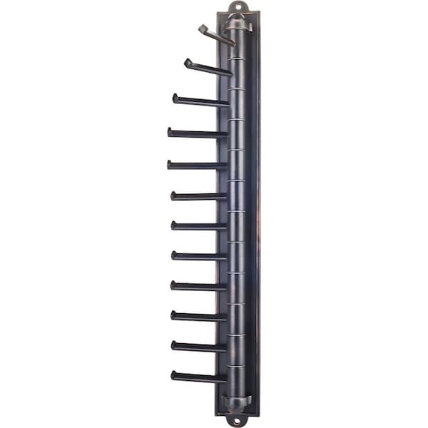 Store 12 ties, scarves, or belts on a small footprint on our 12-hook cascading tie organizer. Its narrow vertical design works great on the face of a closet casing or for tight spaces like behind a door. 12 free-swing hooks allow you to easily put on or pull off items from the rack. Lip on the end of the hook keeps items from sliding off. Mounts quickly with just two screws. Brushed Oil Rubbed Bronze finish.
