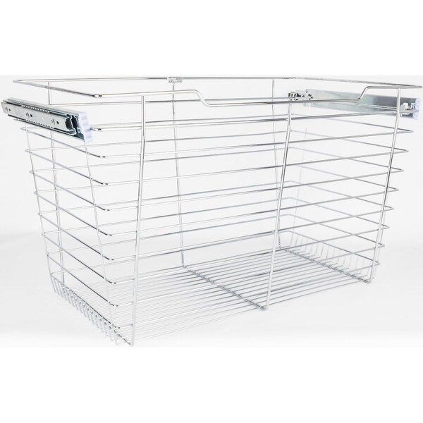 Store your closet essentials in our heavy-duty wire pullout basket. Full-extension slides and sloped front allow for easy access to all your items. Baskets easily remove from slides for ultimate portability. Closet wire baskets are a cost-effective alternative to a 5-piece drawer. Basket measures 14" deep, 29" wide, 17" height. Width is measured from the second wire and the slides add an additional inch. For 30" wide opening. Includes chrome ball bearing slides with hooks to hold basket. Chrome finish.