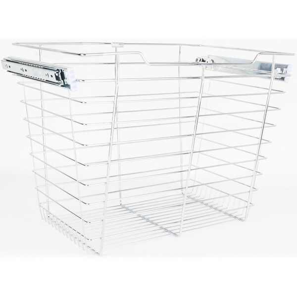 Store your closet essentials in our heavy-duty wire pullout basket. Full-extension slides and sloped front allow for easy access to all your items. Baskets easily remove from slides for ultimate portability. Closet wire baskets are a cost-effective alternative to a 5-piece drawer. Basket measures 16" deep, 23" wide, 17" height. Width is measured from the second wire and the slides add an additional inch. For 24" wide opening. Includes Chrome ball bearing slides with hooks to hold basket. Chrome finish.