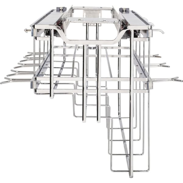 Keep your pans clatter-free with our hanging pan organizer in Polished Chrome finish. Designed to be mounted on the top of the cabinet so pans can hang down like a traditional hanging pot rack, except ours pulls out of the cabinet on Soft-close slides. The double rails on the side of the pullout are fully customizable with an array of hooks. The top rail hooks are designed to hold the pan handle and the second rail is for handle stabilizer bars that keep the pans from free-swinging when moving in and out of the cabinet like other pan pullouts. Hooks are adjustable along the rail with integrated set screws and unit comes with a hex key that stays on the back of the unit so the homeowner can adjust the hooks as needed. The center of the pullout is for holding the lids, so all cookware components stay together. Pullout ships preassembled; just install and add the hooks and cookware!