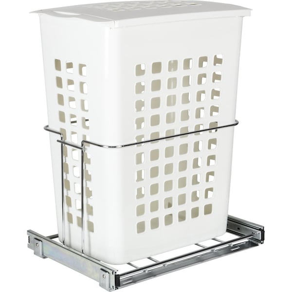 Perfect size for storing laundry in a closet. Pullout hamper is designed to fit in a 24" wide opening that is 14" deep. Plastic hamper includes a lid and sits in a wire frame that includes 100 lb ball bearing slides to gain easy access. Hamper is easily removable to transfer clothes to the washer. Comes fully assembled and mounts to cabinet bottom with just four screws.