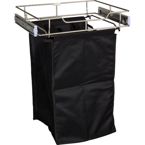 Keep clothing off your closet floor with this pullout hamper with removable canvas laundry bag. Heavy-duty wire frame sits on chrome ball bearing slides for full access in and out of the closet. Laundry basket is removable from frame and has carry handles to easily tote dirty clothes to washer. 17"W x 14"D x 22-1/2"H. Satin Nickel wire with black nylon bag. For 18" wide openings.