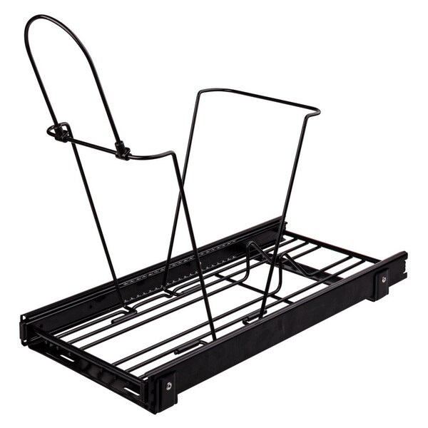 Save room on the kitchen floor by tucking away trash cans in a cabinet with our single can black wire trashcan pullout. Simple wire construction assembles in minutes and installs with just four screws to the bottom of the cabinet. Slides out on 100 lb rated full-extension slides. Comes with a wire handle for hinged door applications. Works with either 50 qt can or 35 qt can. Trash can and lids are sold separately as well as an optional door-mounting kit. Pullout fits in a 12" cabinet opening.