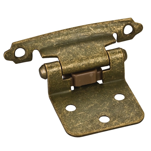 • Traditional 1/2" Overlay Hinge with 4 - #5 x 5/8" Oval Head Screws, 6 - #6 x 1/2" Flat Head Screws and 2 Flat Form Pads • Finish: Burnished Brass