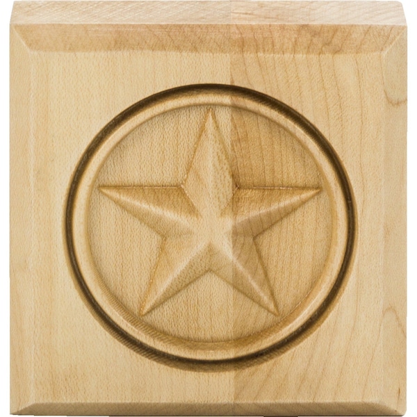 A lone star is the only carved ornamentation needed on this White Birch rosette. It is surrounded by a smooth carved bead to enhance the features of the rosette. This rosette is a subtle and classy transition piece. Overall measurements: 3" W x 7/8" D x 3" H. **Photo not species specific**