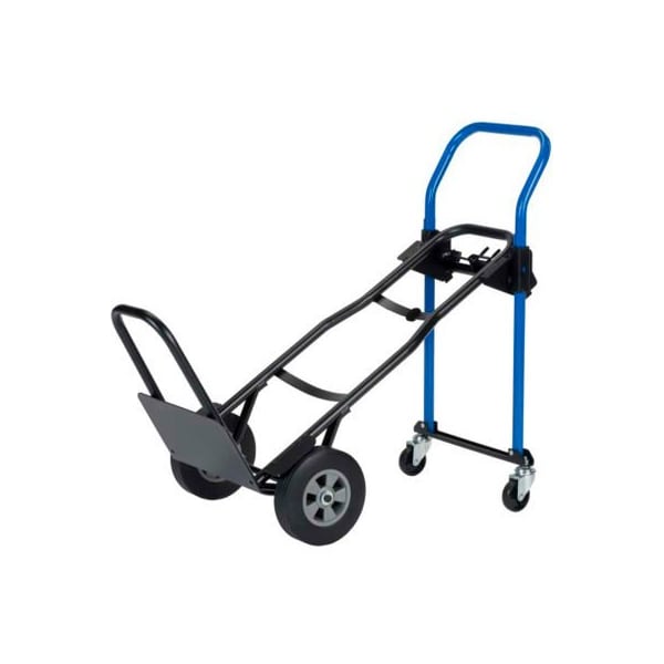 Harper jdcj8523en 3-in-1 convertible hand truck - solid rubber & nose extension - 500 lb. Cap easily converts to three different truck positions and auto locks into place with no pins or clips to lose!! harper trucks 3-1 steel convertible hand truck provides easy conversion from a two-wheel dolly to a four-wheel 45 degree incline truck or platform truck in seconds features: robotically welded 1" steel frame and handle 500 lbs. Two wheel dolly handle height 44" tall easily adjusts to four wheel assist incline truck or four wheel platform truck -500 lbs. Capacity 8" solid rubber wheels and 3" swivel casters 14" x 7-1/2" base plate large 34" x 13" platform bed retractable 18" nose extension for oversized or bulky loads