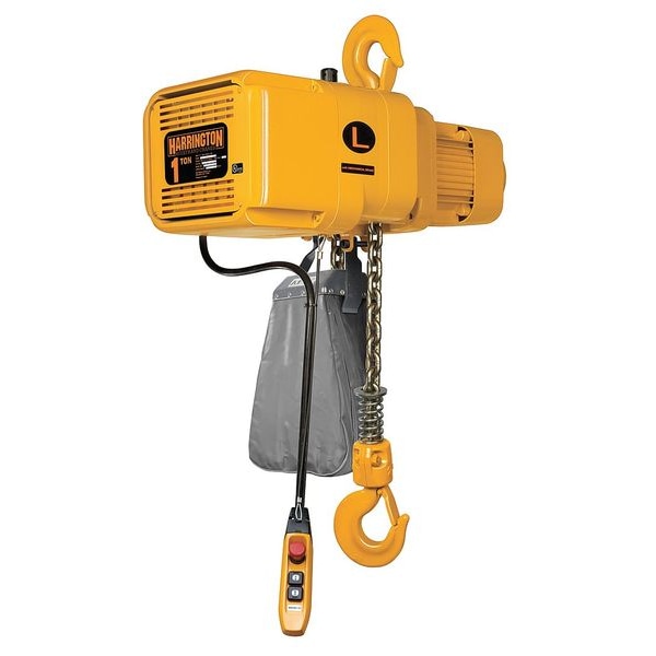 Electric Chain Hoist, Duty Classification H4, Mount Type Hook Mounted - No Trolley, Maximum Lifting Capacity 2,000 lb, Number of Speeds 2, Programmable Programmable by VFD, Fixed Lift Speed Not Applicable, Minimum Lift Speed 2.5 fpm, Maximum Lift Speed 14 fpm, Trolley Speed Not Applicable, Maximum Lifting Length 10 ft, Current at Minimum Voltage 5.1 A, Current at Maximum Voltage 2.7 A, Motor Horsepower 1 1/4 hp, Operating Voltage 230V AC, Headroom 16 29/32 in