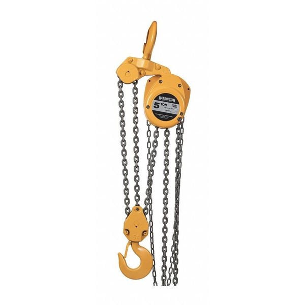 Manual Chain Hoist, Chain Length 11 ft, For Minimum Beam Flange Width Not Applicable, For Maximum Beam Flange Width Not Applicable, Headroom 24 13/32 in, Includes Brake Brake Included, Lifting Hook Type Hook with Safety Latch, Maximum Lifting Capacity 10,000 lb, Maximum Lifting Length 10 ft, Mount Type Hook Mounted - No Trolley, Body Depth 6 in, Body Material Die-Cast Aluminum, Body Width 13 1/2 in, Brake Type Weston Style, Chain Grade Grade 100, Chain Material Manganese Alloy, Color Yellow