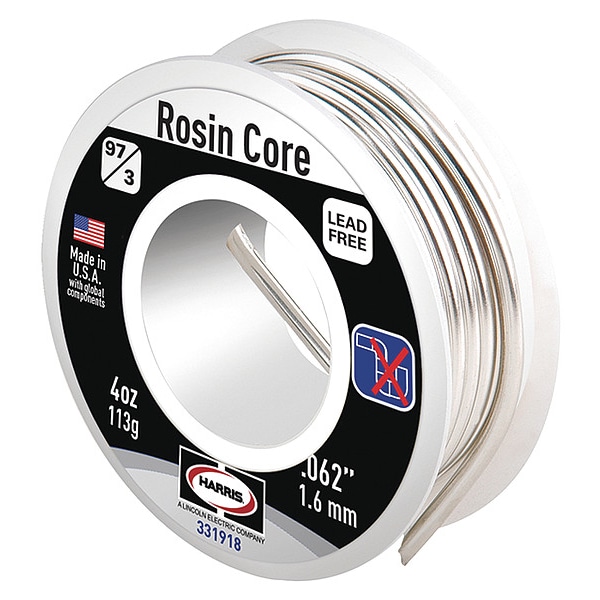 Solder Wire, Form Flux-Cored Wire, Material Composition 97 Percent Tin, 3 Percent Copper, Wire Diameter 0.0625 in, Weight 0.25 lb, Melting Temperature (Maximum) 445 Degrees F, Flux Type Rosin, Solder Series 97/3, Application Appliances, Motors, Speaker Wire, Wiring, Container Type Spool, Flux Requirement Contains Flux Core, Gauge 14, Standards ASTM B-32