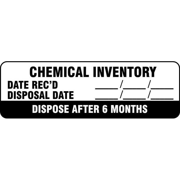 Label, Adhesive Adhesive, Adhesive Material Acrylic, Adhesive Type Permanent Adhesive, Label Color Black, White, Label Diameter Not Applicable, Label Height 7/8 in, Label Material Paper, Label Shape Rectangle, Label Width 2 7/8 in, Language English, Number of Labels 500, Package Type Dispenser Roll, Preprinted Images Not Applicable, Preprinted Legend Chemical Inventory, Date Rec'd __/__/__ , Disposal Date__/__/__ Dispose After 6 Months, Product Type Label, Subject Matter Quality