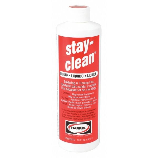 Soldering Flux, Container Capacity 16 oz, Container Type Bottle, Form Liquid, Maximum Active Temperature 700 Degrees F, Flux Series Stay-Clean, Flux Type Inorganic Acid, For Material Type Brass, Copper, Nickel, Stainless Steel, Steel, For Solder Type Lead Free, Leaded, Tin/Antimony, Tin/Lead, Standards A-A-51145SC, Application General Purpose, Not recommended for electrical or electronic applications, Clean Up Type Flux Remover