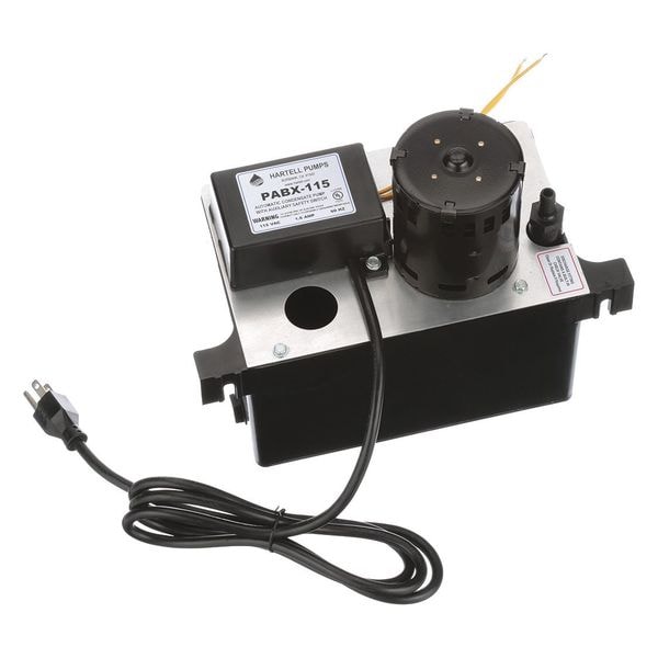 Condensate Removal Pump, Discharge Connection Style Barbed, Horsepower 1/16 hp, Includes Motor Thermal Protection, Intake Connection Style Open, Maximum Feet of Head 22 ft, Maximum Flow Rate @ 10 Feet of Head 1.8 gpm, Maximum Flow Rate @ 15 Feet of Head 0.9 gpm, Maximum Flow Rate @ 1 Foot of Head 2.3 gpm, Maximum Flow Rate @ 20 Feet of Head 1.13 gpm, Maximum Media Temperature 110 Degrees F, Nameplate Voltage 115V AC, Plenum Rated No, Pump Type Standard, Series PABX, Series Family PABX