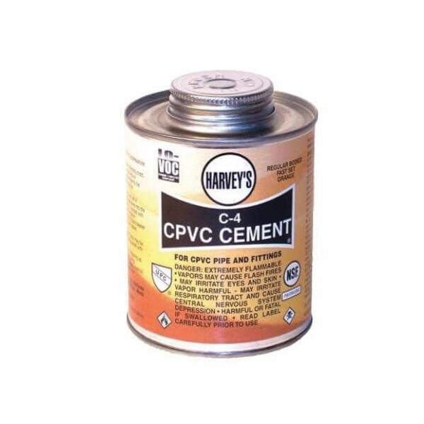 Harvey CPVC Solvent Cement, Regular Low VOC, Series C4, 4 oz Container, Dauber In Bottle Container, 9 lb Net Weight, For Use With Up to 4 in CPVC Pipe and Fittings, Liquid Form, Orange, Solvent OdorScent, 490 gL VOC, 14 to 23 deg F Flash Point, Composition Tetrahydrofuran, Methyl Ethyl Ketone, Ethene, Chloro, Homopolymer, Chlorinated, Cyclohexanone, Acetone, 091 Specific Gravity, 4 to 5 min Setting, 2 hr CuringHarvey C4 CPVC Cement is a regularbodied, fastset orange cement for use on all schedules and classes of CPVC pipe and fittings up to 4 diameter with interference fit