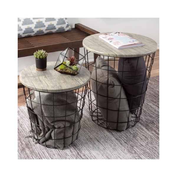 The Wire and Wood Nesting End Table Set from Hastings Home includes two wire basket style bases that can be used as a minimalist display or convenient storage and are topped with wooden lids to create a functional tabletop. The brown metal bases can be filled with decorative accents, used to store throw pillows or blankets, and can also be packed with large toys in a kid's room to keep it tidy. The set of nesting tables come in two different sizes and have durable MDF wood tabletops with a gray woodgrain veneer that will complement rustic industrial or modern farmhouse decor in your living room, office, bathroom, bedroom and more - the possibilities are endless!