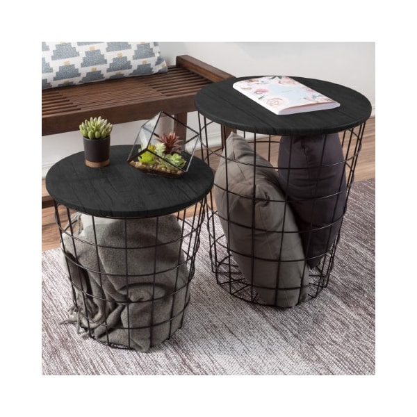 The Wire and Wood Nesting End Table Set from Hastings Home includes two wire basket style bases that can be used as a minimalist display or convenient storage and are topped with wooden lids to create a functional tabletop. The black metal bases can be filled with decorative accents, used to store throw pillows or blankets, and can also be packed with large toys in a kid's room to keep it tidy. The set of nesting tables come in two different sizes and have durable MDF wood tabletops with a black woodgrain veneer that will complement rustic industrial or modern farmhouse decor in your living room, office, bathroom, bedroom and more - the possibilities are endless!