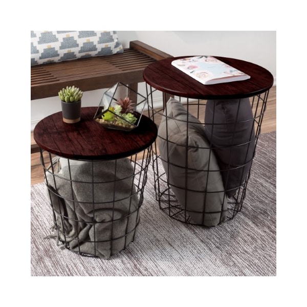 The Wire and Wood Nesting End Table Set from Hastings Home includes two wire basket style bases that can be used as a minimalist display or convenient storage and are topped with wooden lids to create a functional tabletop. The metal bases can be filled with decorative accents, used to store throw pillows or blankets, and can also be packed with large toys in a kid's room to keep it tidy. The set of nesting tables comes in two different sizes and have durable MDF wood tabletops with a cherry woodgrain-look veneer that will complement rustic industrial or modern farmhouse decor in your living room, office, bathroom, bedroom and more - the possibilities are endless!