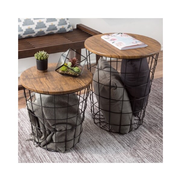 The Wire and Wood Nesting End Table Set from Hastings Home includes two wire basket style bases that can be used as a minimalist display or convenient storage and are topped with wooden lids to create a functional tabletop. The black metal bases can be filled with decorative accents, used to store throw pillows or blankets, and can also be packed with large toys in a kid's room to keep it tidy. The set of nesting tables come in two different sizes and have durable MDF wood tabletops with a woodgrain veneer that will complement rustic industrial or modern farmhouse decor in your living room, office, bathroom, bedroom and more - the possibilities are endless!