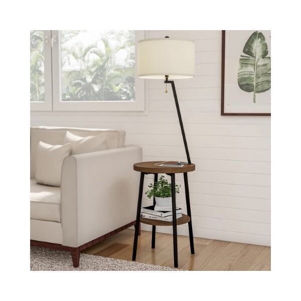 This Two-Tier End Table Floor Lamp from Hastings Home illuminates your space while adding functional furniture that is perfect for a bedroom, living room, apartment, or dorm room, Designed with two durable woodgrain veneer shelves, black iron angled legs, a built-in USB port for charging devices, a pull chain cord and an off-white drum shade, this versatile end table will complement rustic, modern farmhouse, or mid-century style decor, The lamp comes with an energy-efficient 9W 805 lumens LED bulb that will brighten your room for 25,000 hours before needing to be replaced,