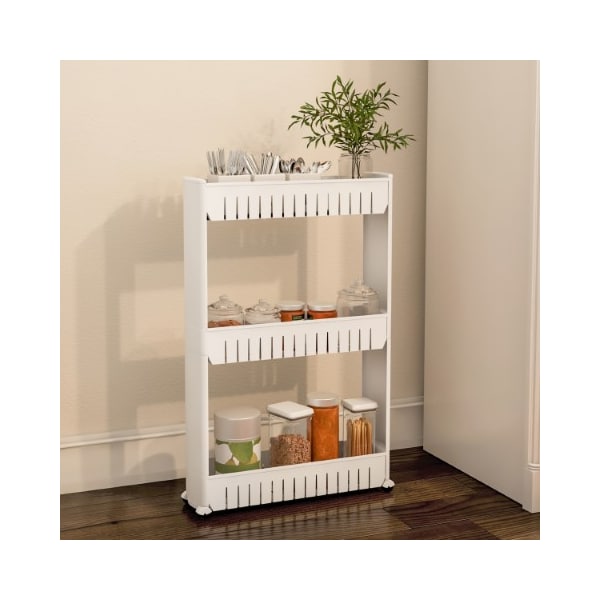The 3-Tier Slim Rolling Cart from Hastings Home has a narrow 5-in wide design to fit in small spaces like in between the washer and dryer, next to the toilet, or next to the refrigerator. Featuring a durable plastic construction with smooth rolling PVC casters, this thin shelving unit is great for storing and organizing detergent, spices, toiletries, household essentials, canned goods and craft supplies - the possibilities are endless.