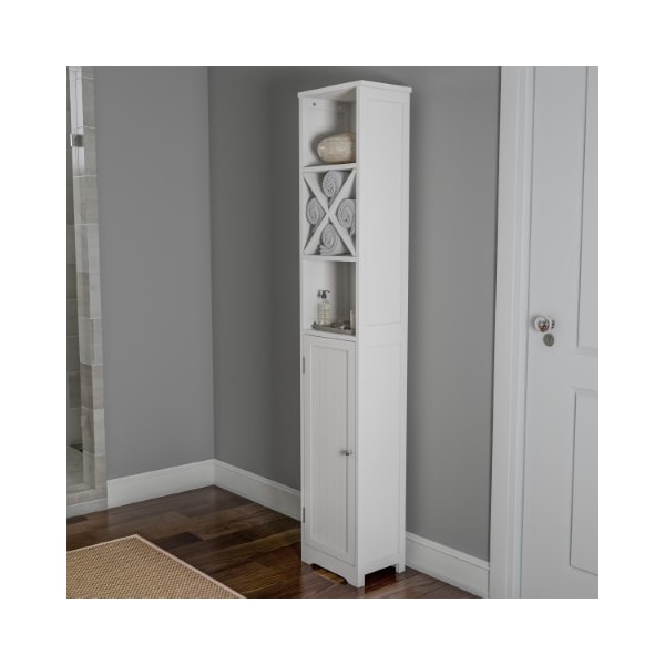 Create additional storage in a small bathroom with the Hastings Home Freestanding Linen Cabinet! This narrow shelving unit provides plenty of storage and organization space, and also makes a stylish addition to your bathroom. With lots of shelving and cabinet space, you can easily store toiletries, makeup, linens, or towels, while the sturdy engineered wood construction and included anti-tipping hardware make it a safe and long-lasting storage solution for your home.