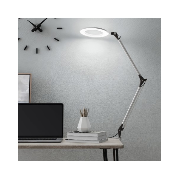 The Clamp-On Architect Lamp by Hastings Home is a modern minimalist-inspired light fixture offering total adjustability and excellent natural daylight LED illumination. With a maximum reach of 42-inches, this lamp can be positioned at any angle with its double-hinged rotating arm, flexible head and sturdy metal clamp that can be attached to any desk, table, or headboard up to 2.5" thick. Great for home offices, studies and nightstands, the LED light ring has a CRI of 95 and a stepless dimming switch that offers reduced eyestrain while performing just about any task.
