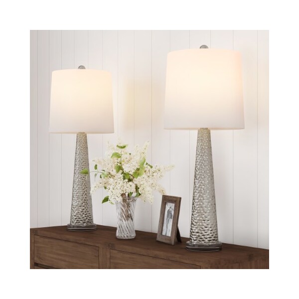 This set of Slim Hammered Style Glass LED Lamps from Hastings Home illuminates your space while adding a touch of elegance to your home, Designed with a slim tall cone shaped body of glass with hammered style texture in metallic brushed silver finish, these beautiful lamps are paired with ivory drum shaped fabric shades for a blend of modern touch of vintage glam style perfect for your living room, entryway, bedroom, or office, Each lamp comes with an energy-efficient 9W 805 lumens LED bulb that will brighten your room for 25,000 hours before needing to be replaced,