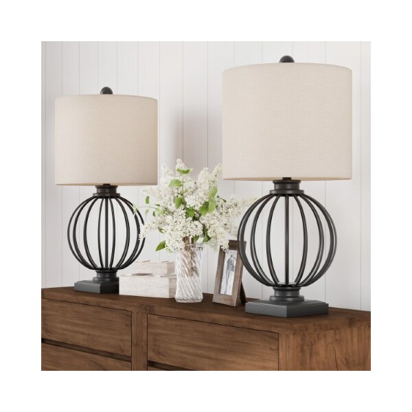 This set of Iron Sphere Cage Lamps from Hastings Home illuminates your space while adding a touch of elegance to your home. The wrought iron open-style orb bases are paired with natural linen drum shaped fabric shades for a modern rustic look perfect for your living room, entryway, bedroom, or office. Each lamp comes with an energy-efficient 9W 805 lumens LED bulb that will brighten your room for 25,000 hours before needing to be replaced.