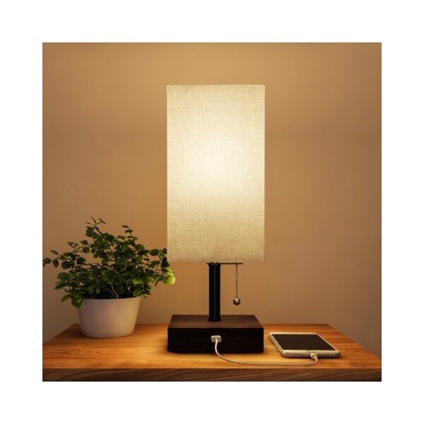 This Rectangular Minimalist LED Table Lamp from Hastings Home adds warm ambient light that's great for sleeping or reading in your bedroom, dorm room, living room, office, or kid's room, Designed with a stable wooden base, a convenient built-in USB charging port, a ball pull chain and a textured natural linen colored rectangle drum shade, this lamp will complement rustic, modern farmhouse, or mid-century style decor, The lamp comes with an energy-efficient 9W 805 lumens LED bulb that will brighten your room for 25,000 hours before needing to be replaced,
