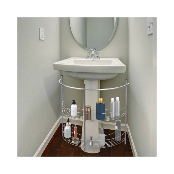 Add valuable storage space to your bathroom with the Pedestal Sink 2-Shelf Organizer from Hastings Home. This open style rack features 2 semi-circle shelves that can hold up to 10-pounds of toiletries, washcloths, or accent decor each, an upper rail you can use to hold hand towels, and has a chrome plated finish that is sure to complement the color of any bathroom. This freestanding shelving unit makes it simple to turn unused space under your pedestal sink into functional storage while keeping your bathroom clutter free!