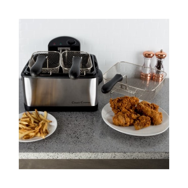 Enjoy all your favorite fried foods from the comfort of your own home with the Tabletop Electric Deep Fryer from Hastings Home. This stainless-steel hot oil cooker comes with 2 small baskets for frying 2 different snacks simultaneously and a full-size fry basket for larger batches of chicken wings, onion rings, French fries, battered vegetables, meats, and fish. This electric deep fryer also features dual indicator lights - one for power and the other telling you the oil is up to temperature, a temperature dial from 250-375 degrees, and a see through window on the top of the unit for easy viewing making it simple to cook appetizers, dinner, or gameday snacks!
