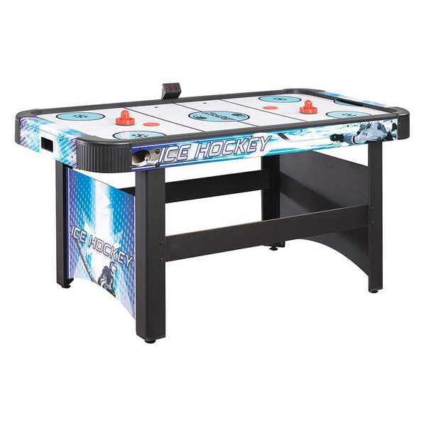 Air Hockey Table, Frame Color Black, Blue, Playing Surface Color White, Frame Material Medium Density Fiberboard, Number of Pucks 2, Number of Strikers 2, Overall Length 60 in, Overall Width 29 5/8 in, Overall Height 31 in, Scoring System Automatic Electronic, Playing Surface Length 54 5/8 in, Playing Surface Width 27 1/8 in, Includes Assembly Tools No, Leveling Feet Yes, Number of Feet 4, Support Style Legs, Voltage 110 V, Assembly Unassembled, Includes (2) Pucks, (2) Strikers
