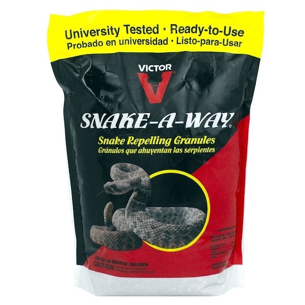 Victor SnakeAWay snake repelling granules effectively drive off garter snakes, rattlesnakes and other snake species from areas they are not wanted This granular snake repellent can be applied around the perimeter of the area you want to protect, including residential yards, parks, businesses and livestock areas SnakeAWay is detected by the snake jacobson organ an additional olfactory sense organ and disrupts its usage, causing the snake to slither away in search of fresh air While wearing gloves, apply the granules to the perimeter of the area that is to be protected Lay down bands 4 to 5 in W to repel garter snakes and 8 to 12 in W to repel rattlers For yard application, sprinkle SnakeAWay throughout the area within the perimeter When odor becomes faint, reapply The formula contains naphthalene and sulfur as its active ingredients