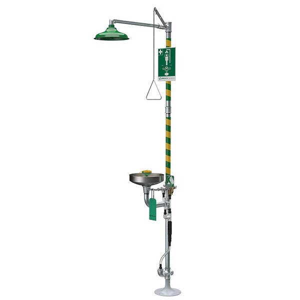Shower with Eyewash, Barrier Free No, Bowl Style Uncovered, Coverage Eyes, Eyewash Bowl Material Stainless Steel, Hazardous Location Rating Not Rated, Includes AXION(R) MSR Hydrodynamic Showerhead, Inspection Tag, Powder-Coated Cast Iron 9 in Diameter Floor Flange, Self-Adhesive High Visibility Safety Green and Bright Yellow Stripes, Universal Sign, Includes Foot Pedal No, Includes Showerhead Shroud Yes, Inlet Connection Location Top, Inlet Pipe Gender Female, Inlet Pipe Size 1 1/4 in